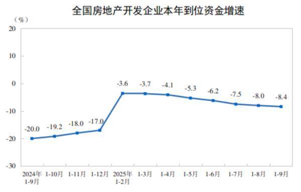 1—9月份,房地产开发企业到位资金72299亿元,同比下降8.4%。其中,国内贷款11294亿元,下降1.4%;利用外资18亿元,下降37.3%;自筹资金26111亿元,下降9.3%;定金及预收款21138亿元,下降10.3%;个人按揭贷款9884亿元,下降10.6%。